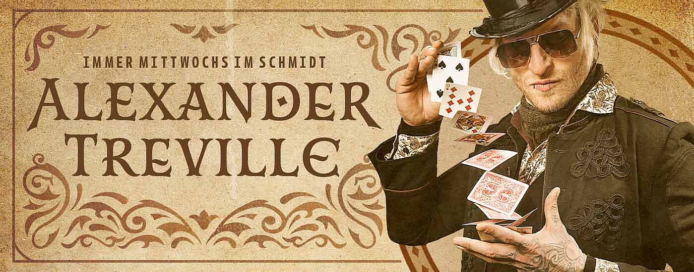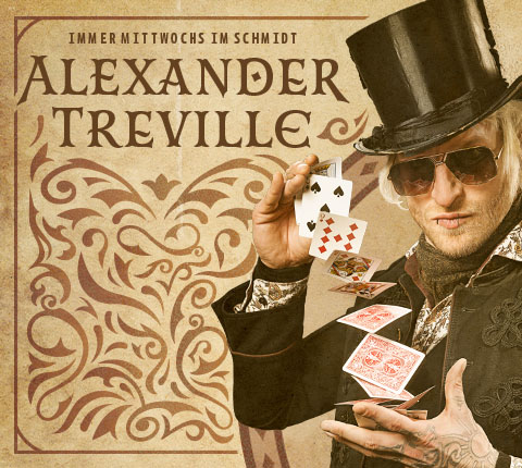 Und eines Tages stand er vor der Tür des Schmidt Theaters und stellte fest, dass er sich hier ab sofort die Ehre geben würde. Als Einstand zauberte er Corny Littmann den Bismarck vom Hering und nun also dürfen wir voller Stolz verkünden, dass der große Alexander Treville jeden Mittwoch Kostproben seiner atemberaubenden Fähigkeiten gibt.